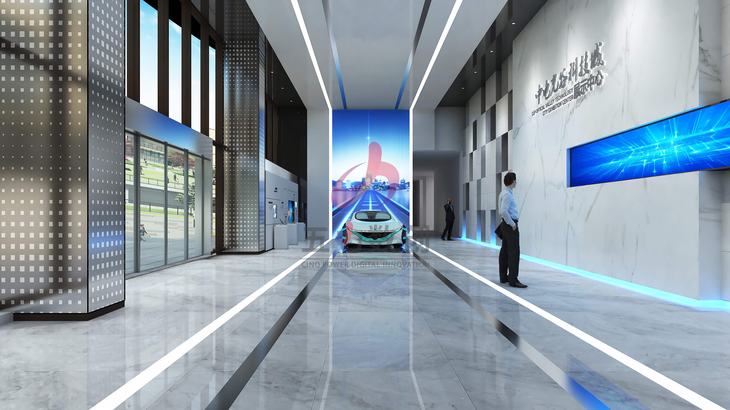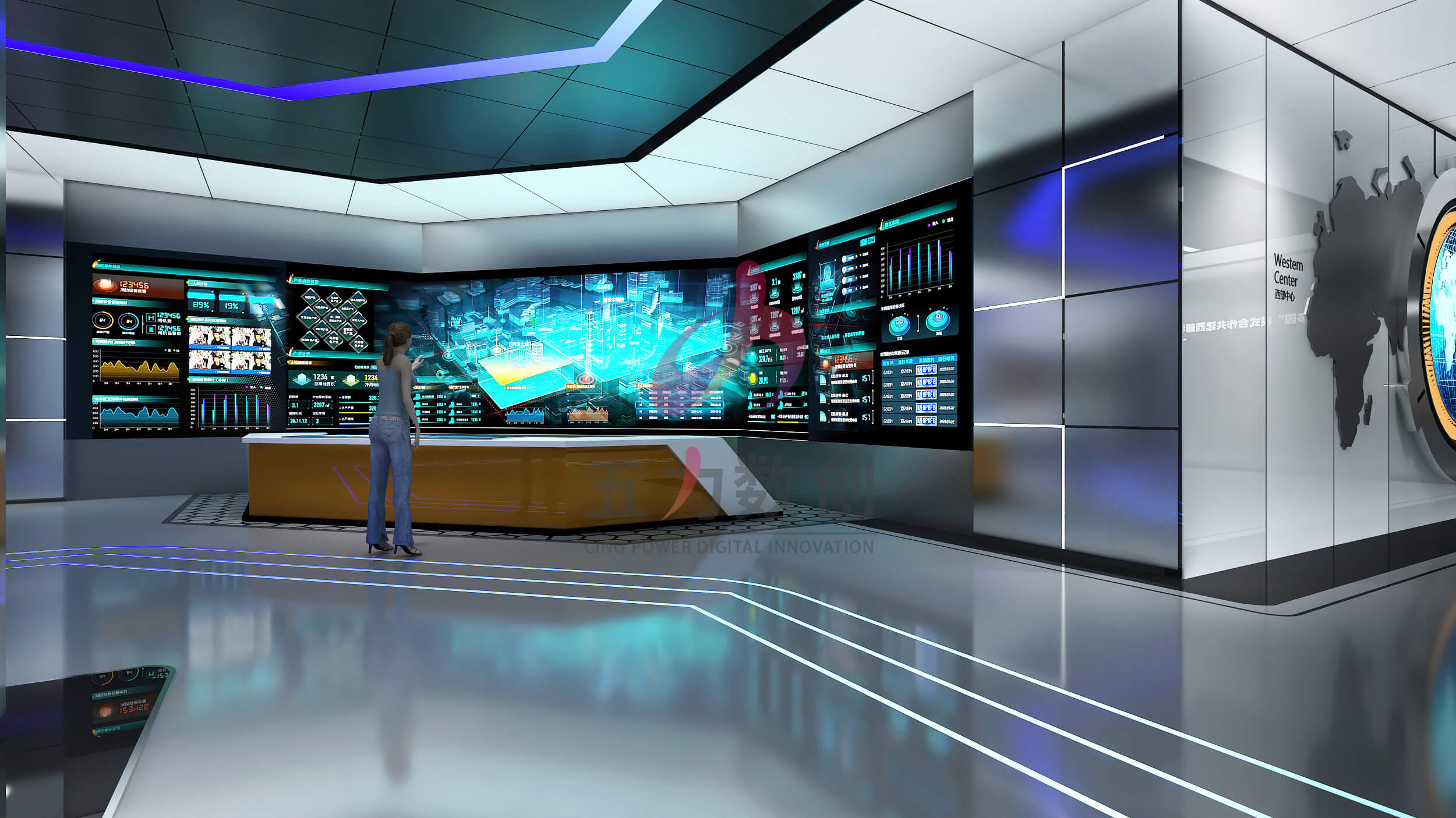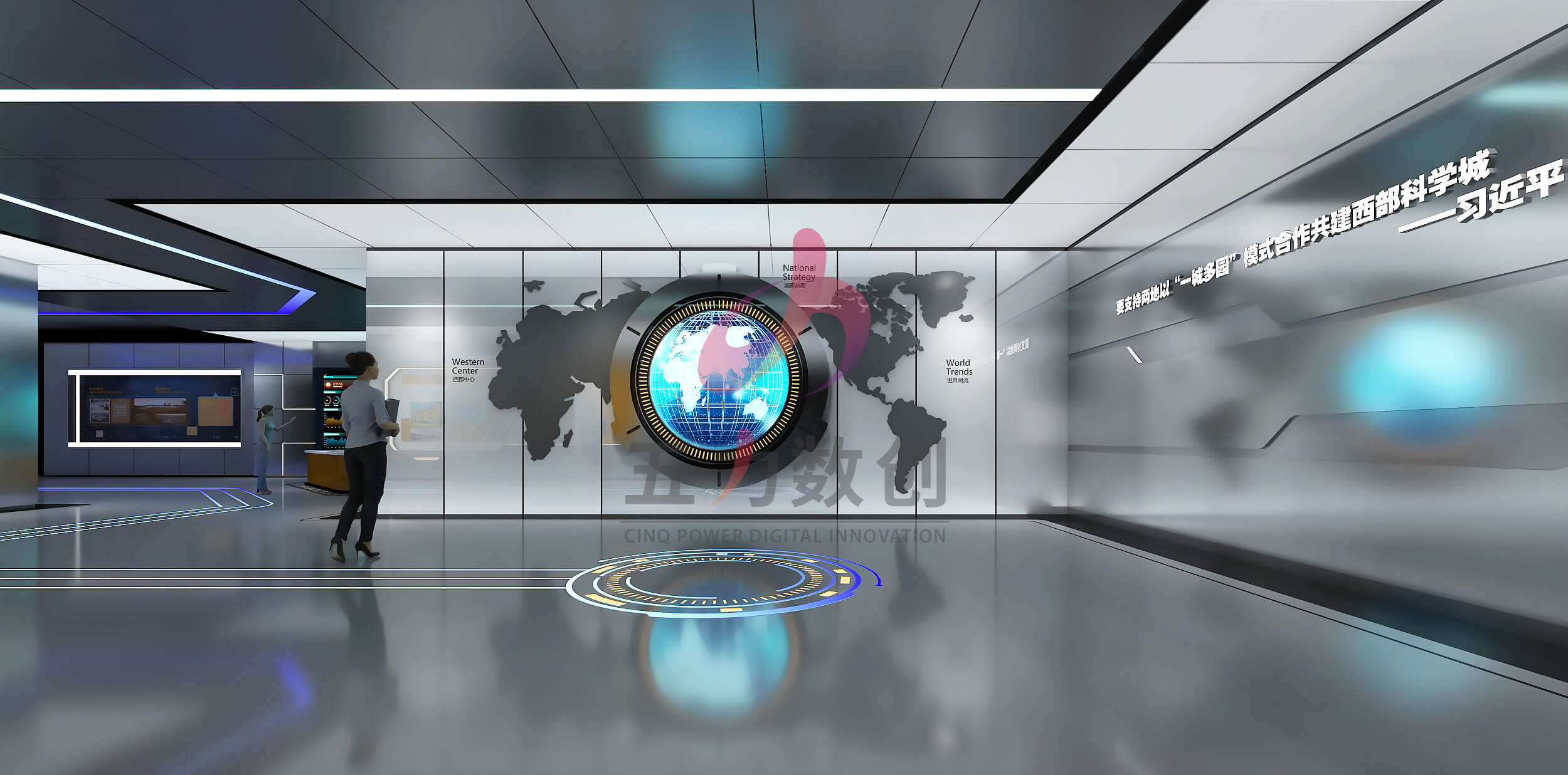 中電光谷科技城展示中心占地面積約為895㎡,共劃分為序廳,戰(zhàn)略篇、平臺篇、產業(yè)篇、未來篇五大展區(qū)。展廳設計以藍色和灰色為主色調,營造濃厚的工業(yè)風格;提取重慶山城設計元素和科技線條營造充滿現(xiàn)代感,科技感,未來感又獨具本地特色的展示空間。同時以數(shù)字沙盤、多媒體互動裝置、弧幕影院等多種數(shù)字多媒體展項布局,呈現(xiàn)沉浸場景,智能體驗,全方位展現(xiàn)園區(qū)項目和服務,整體規(guī)劃和產業(yè)集聚以及優(yōu)勢成果,生動彰顯中電光谷在行業(yè)里的智造地位和強大實力,體現(xiàn)中電光谷的園區(qū)價值和孵化能力,助力招商引資。