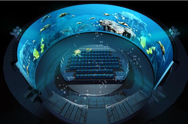 環(huán)幕的投影幕弧度為360度全封閉無縫拼接的影院。一般我們會在圓形空間中央設(shè)置環(huán)形看臺,這樣參觀者可以從任何角度都可欣賞環(huán)幕影片,非常有代入感,仿佛人們都融進影片的場景之中。環(huán)幕的沉浸感是否強烈關(guān)鍵在于數(shù)字影片的創(chuàng)意和鏡頭運動產(chǎn)生的畫面代入感和立體感的強弱。往往適合表現(xiàn)具有宏觀大場景,多場景的內(nèi)容。